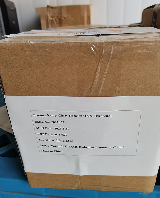 Z-9-Tricosene is a sex pheromone produced by female house flies (Musca domestica) to attract males. In bees, it is one of the communication pheromones released during the waggle dance. This product is an insect pheromone synthesized by our company using a chemical synthesis method. It has a good attracting effect on cockroaches and flies. It can improve the insecticidal efficiency of insecticides when used in combination with insecticides. This product is only used as an attractant in insecticides.